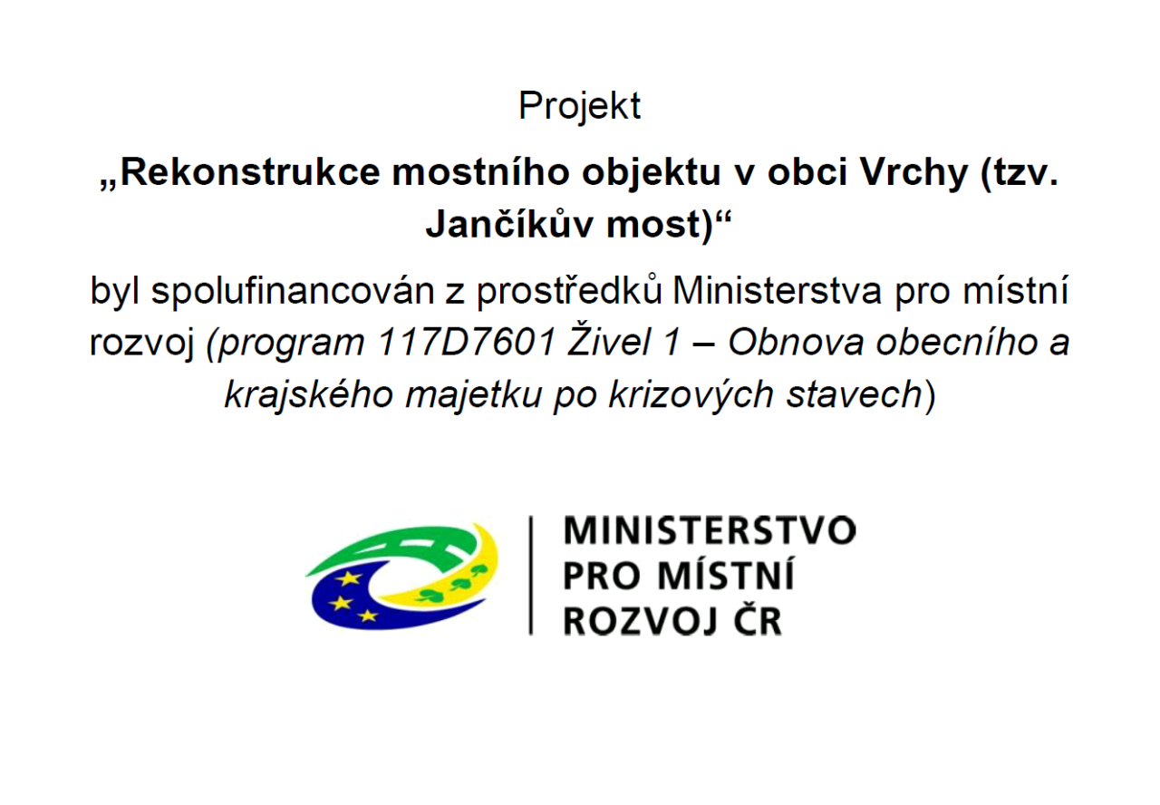Projekt „Rekonstrukce mostního objektu v obci Vrchy (tzv. Jančíkův most)“ byl spolufinancován z prostředků Ministerstva pro místní rozvoj (program 117D7601 Živel 1 – Obnova obecního a krajského majetku po krizových stavech)